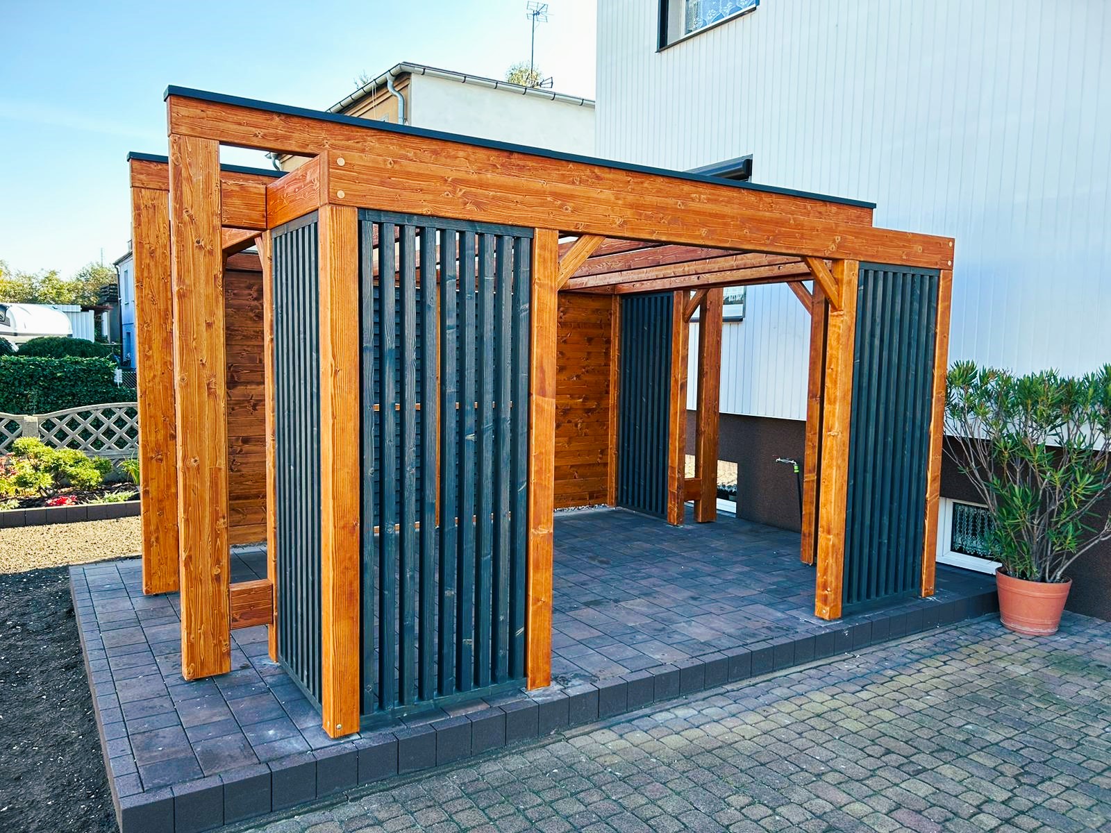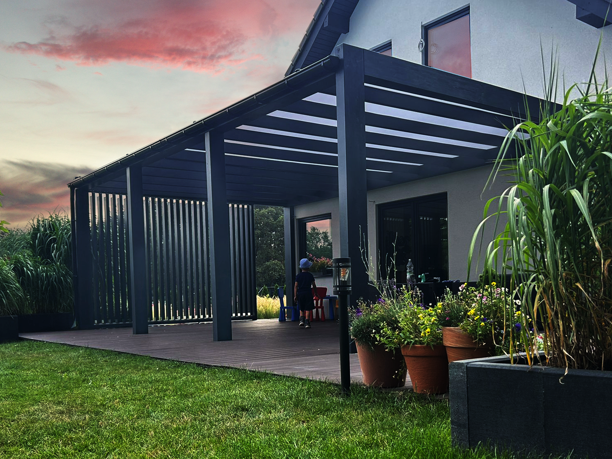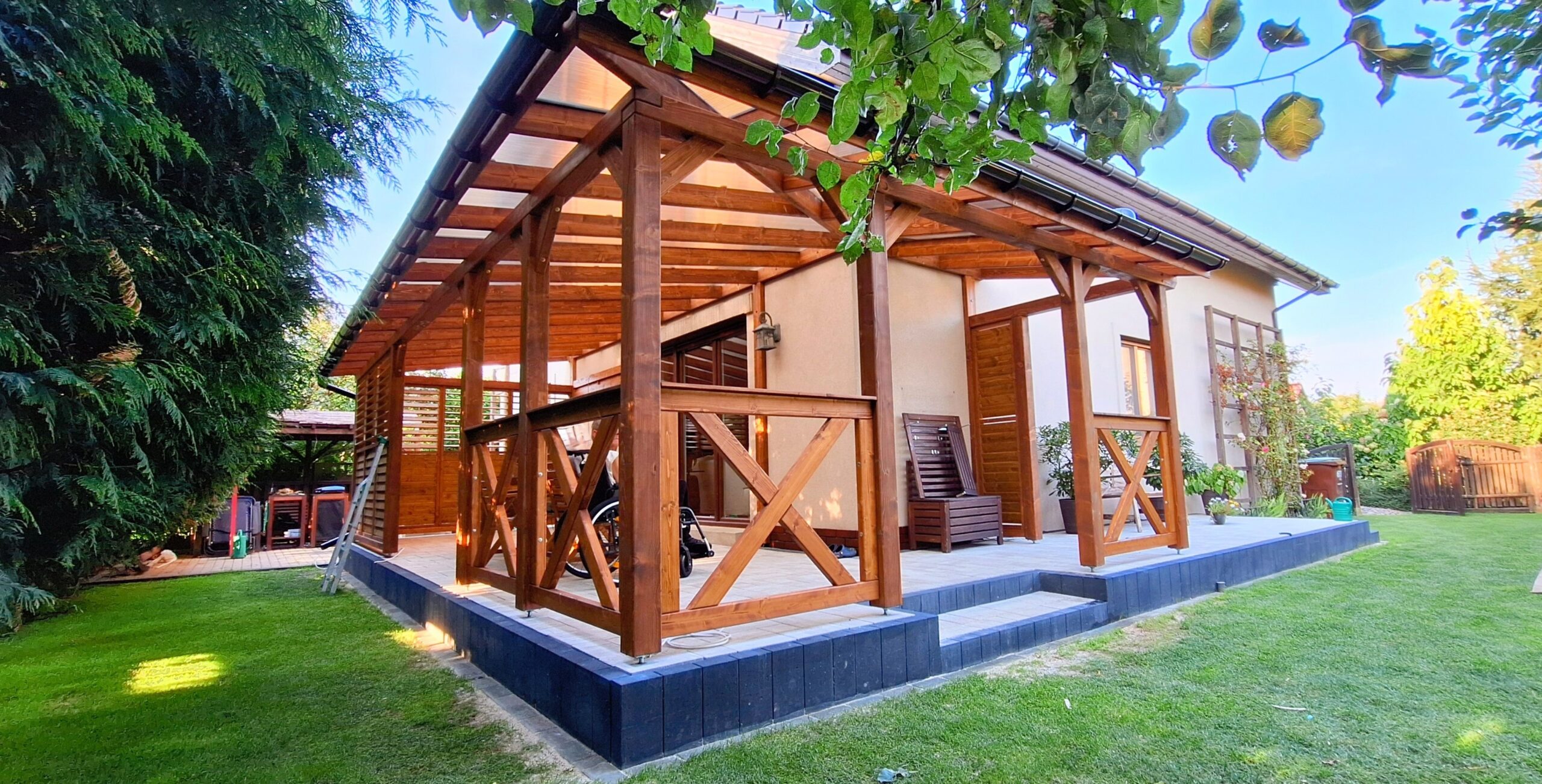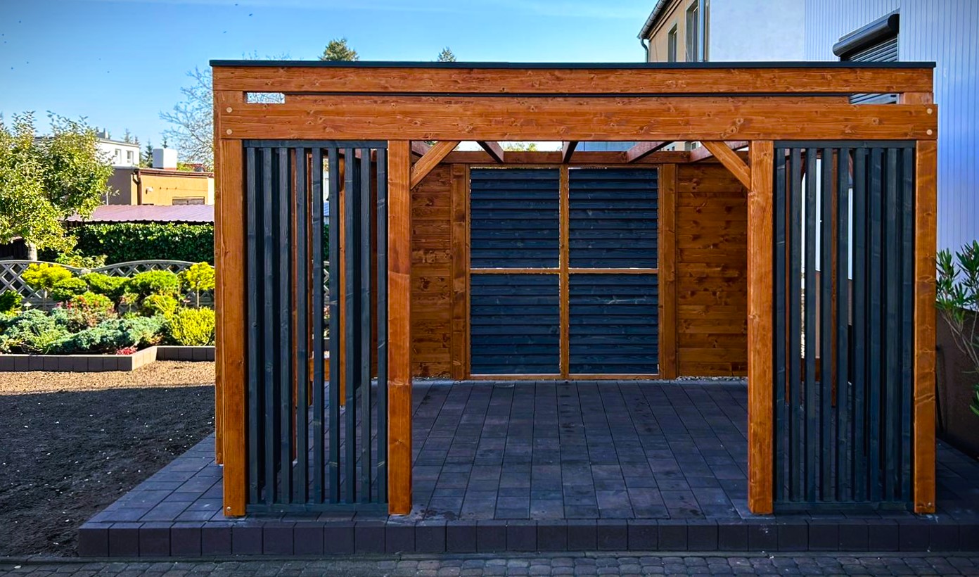 Zabudowane ściany zapewniają ochronę przed słońcem i wiatrem a jednocześnie podnoszą komfort użytkowania oraz estetykę całej konstrukcji.