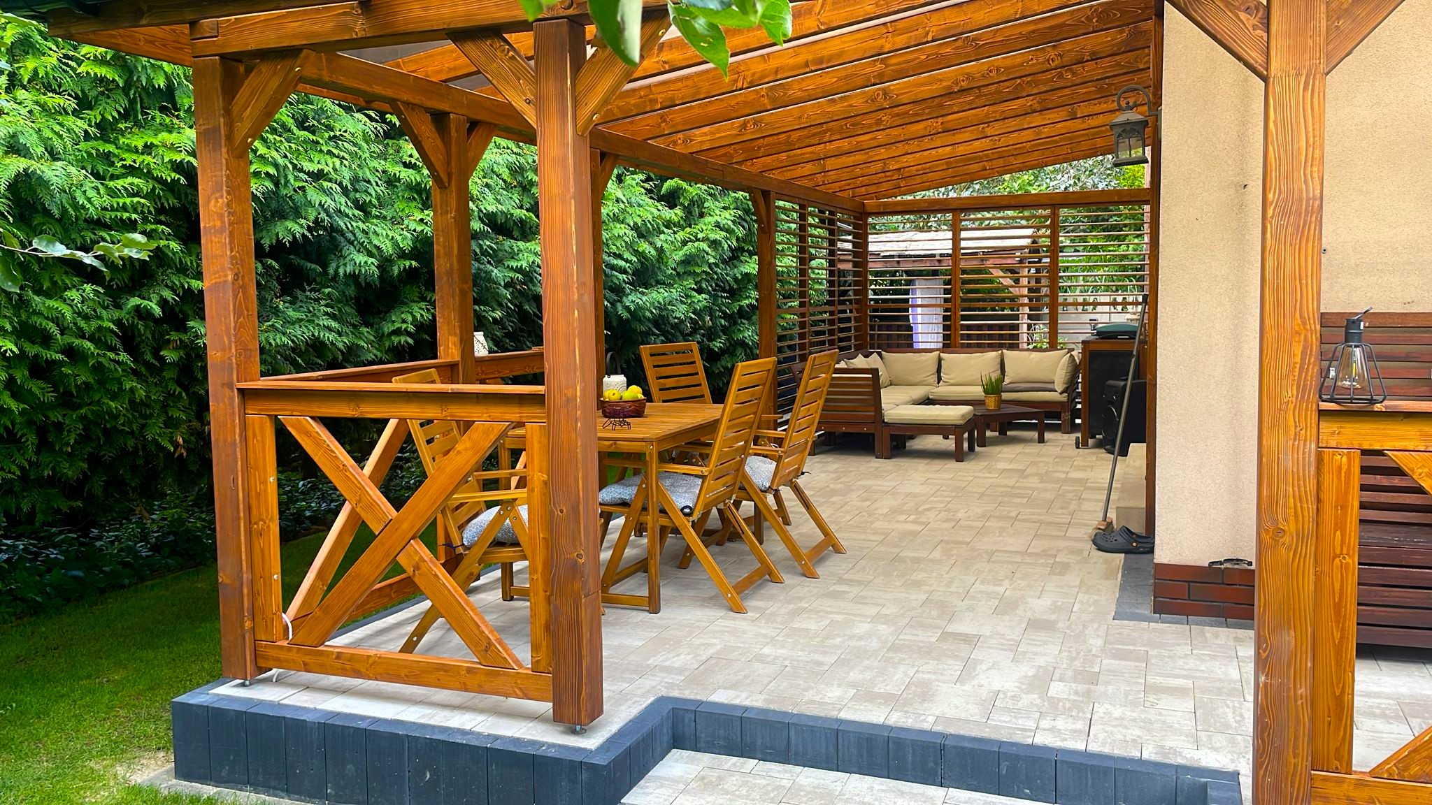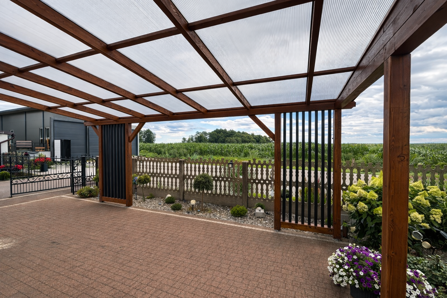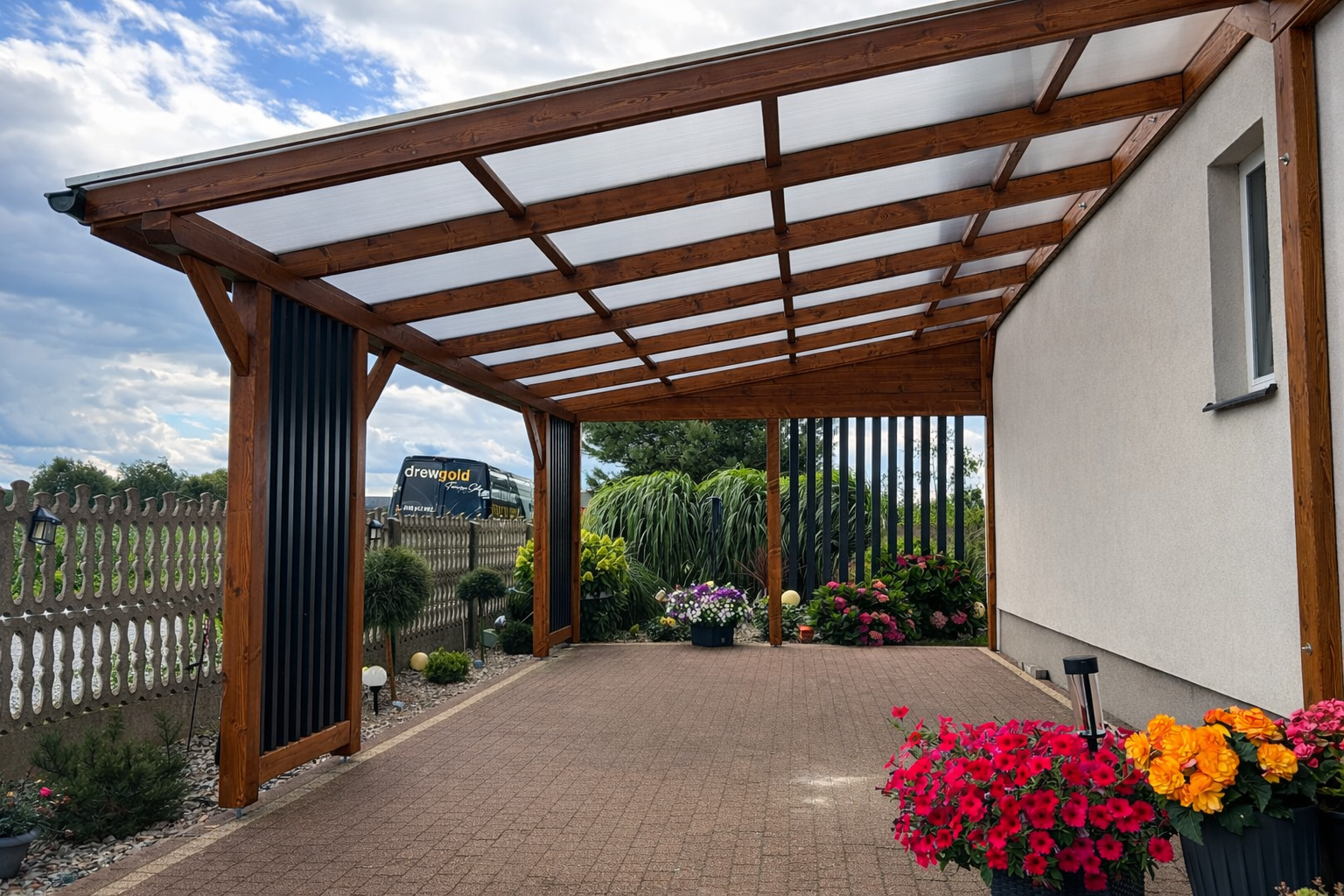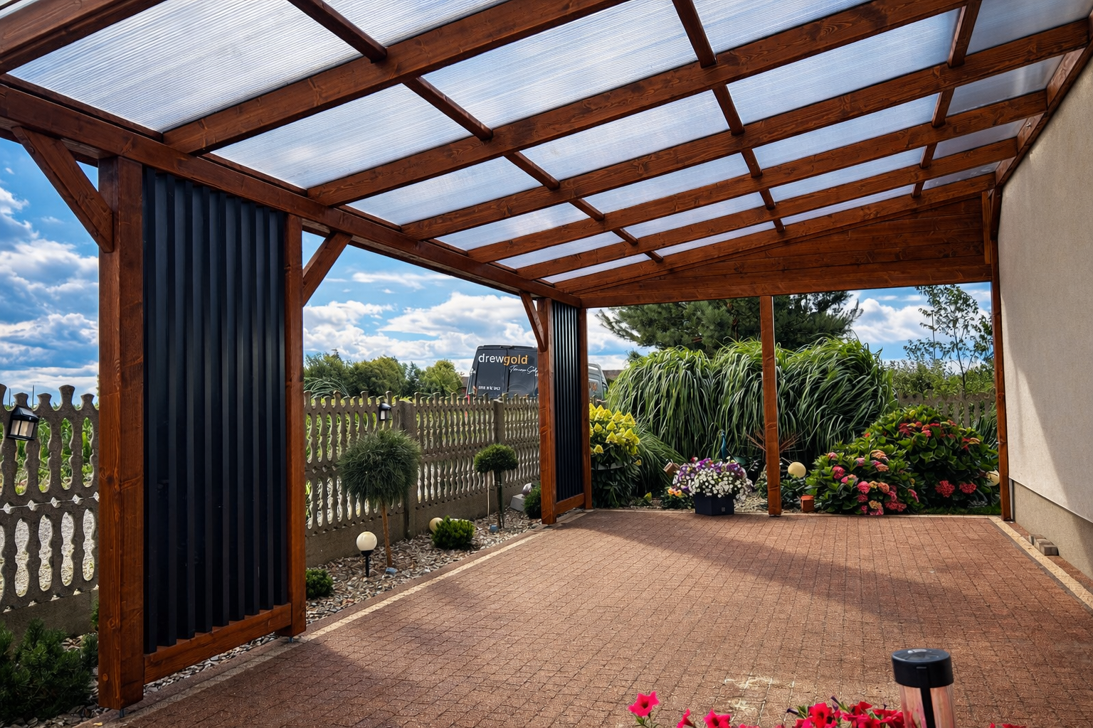 Pełne deskowanie ścian to rozwiązanie dla osób, które cenią większą zabudowę i wyraźnie wydzieloną przestrzeń. Zapewnia solidne osłonięcie oraz spójny, jednolity wygląd konstrukcji.
