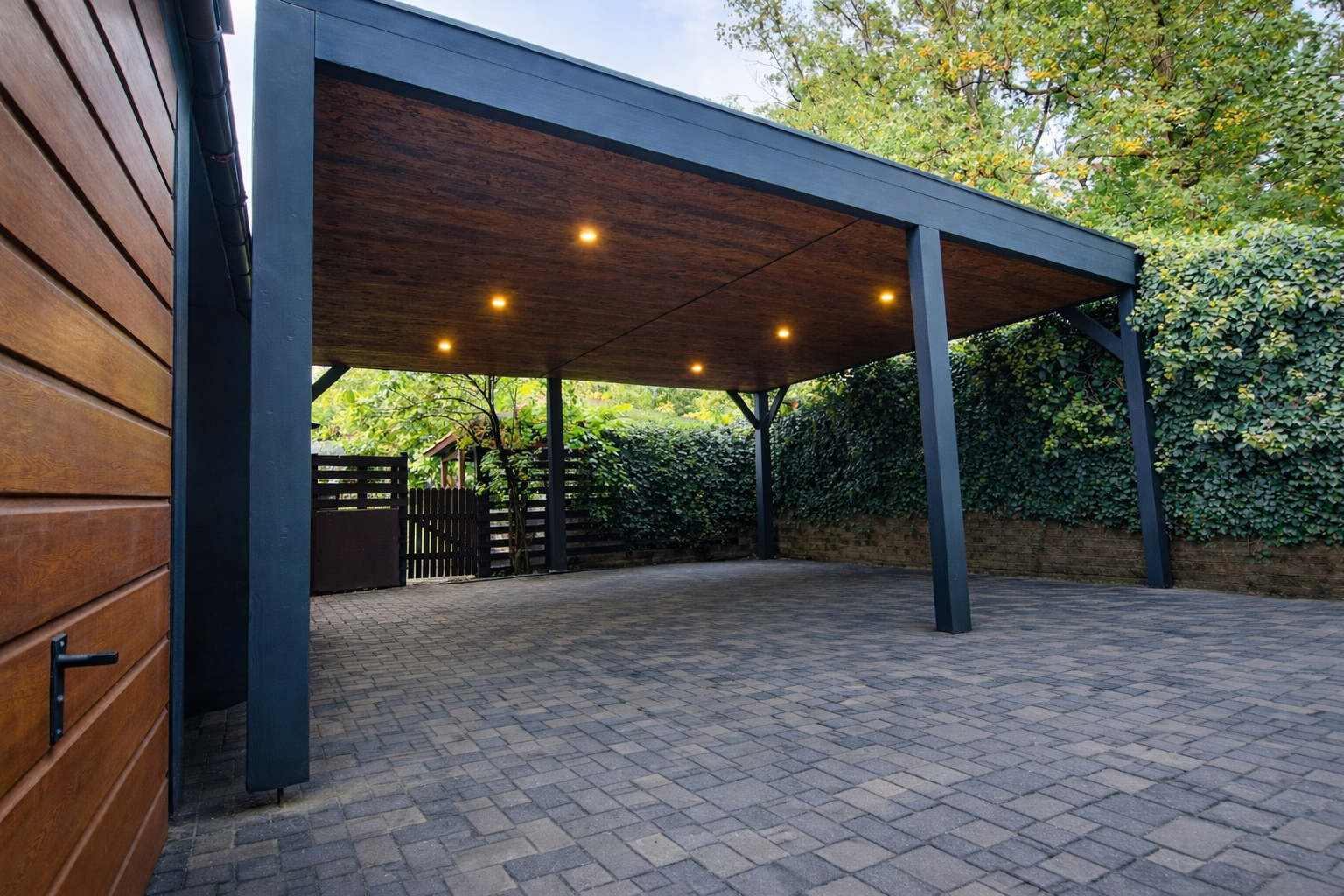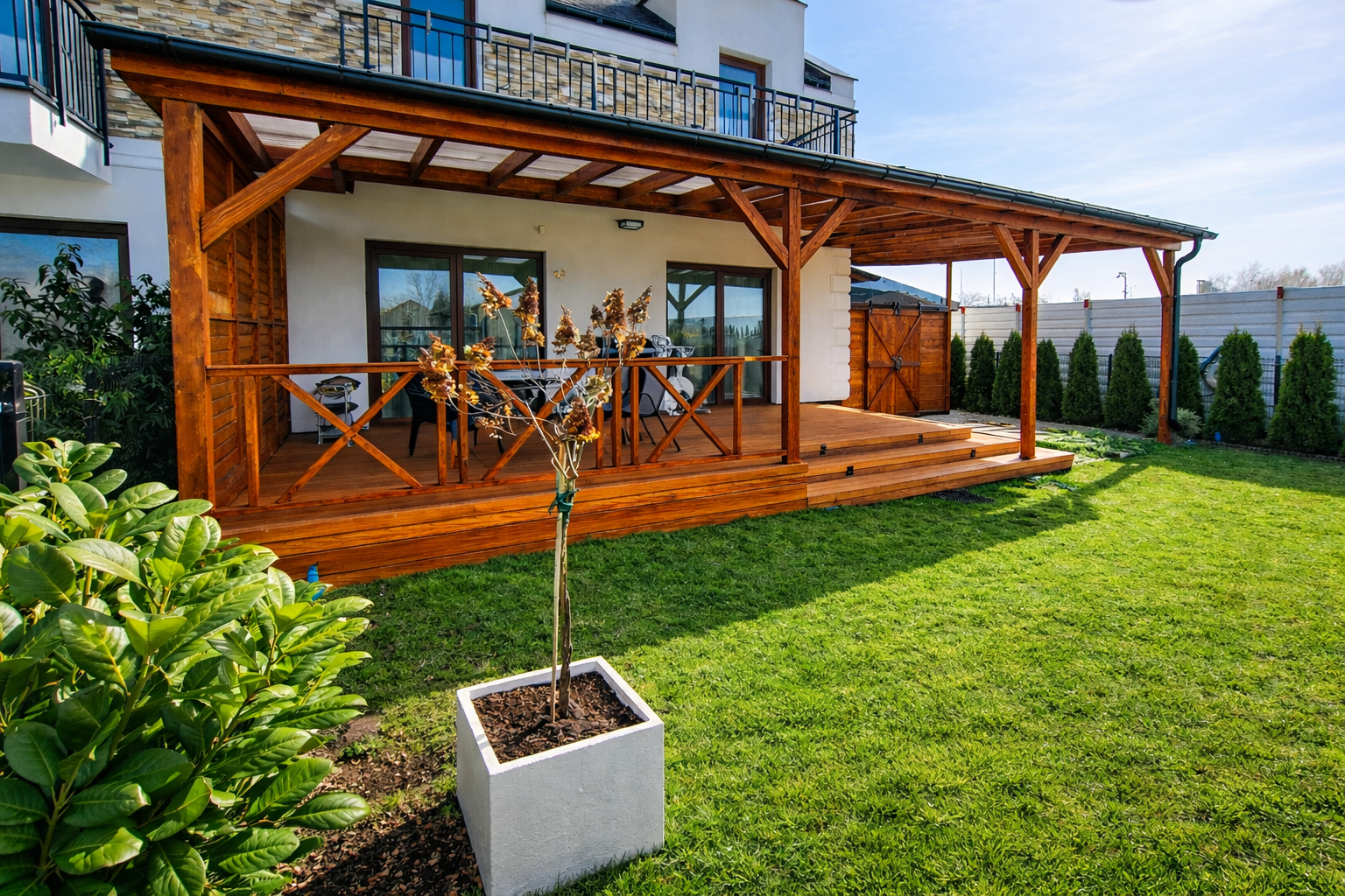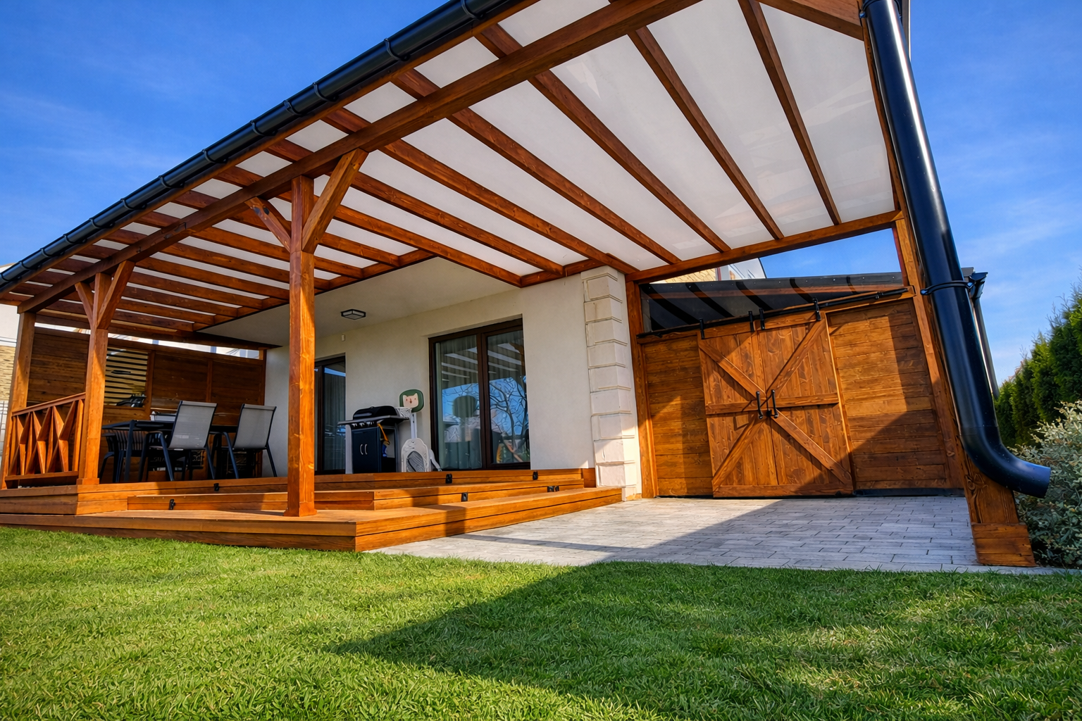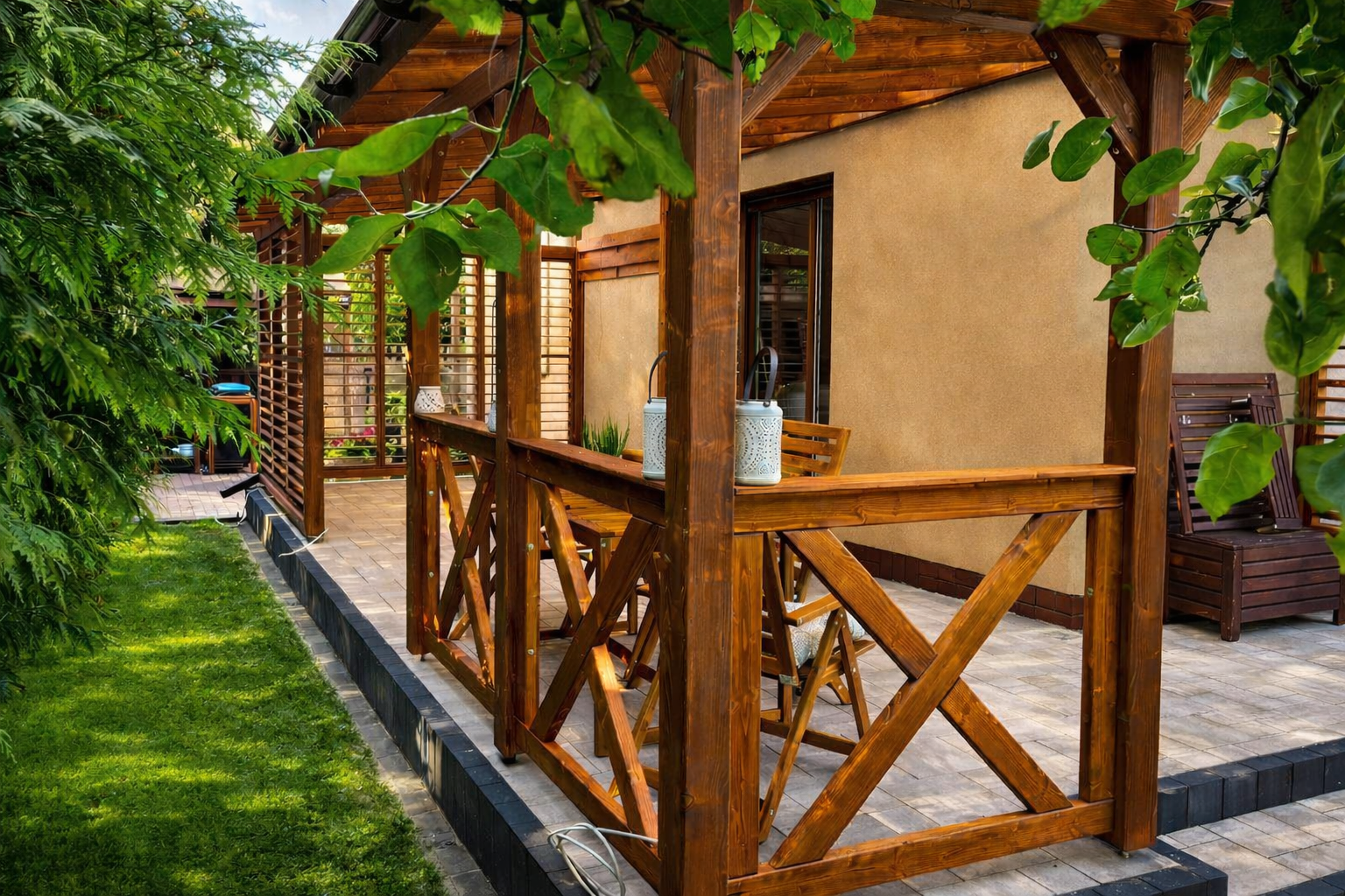 Pełne deskowanie ścian to rozwiązanie dla osób, które cenią większą zabudowę i wyraźnie wydzieloną przestrzeń. Zapewnia solidne osłonięcie oraz spójny, jednolity wygląd konstrukcji.
